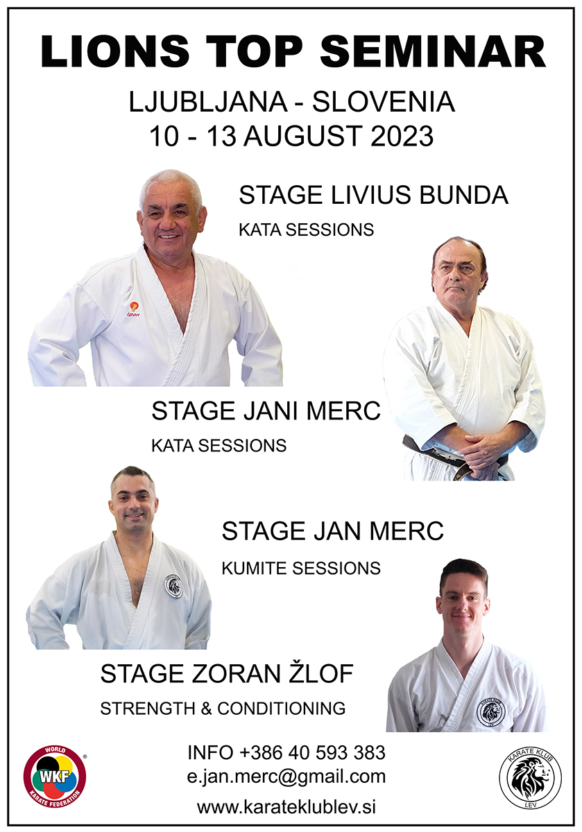 Vabljeni na štiridnevni seminar, ki ga bodo od 10. do 13. 8. 2023 v Ljubljani vodili sensei Janko Merc, sensei Livius Bunda, sensei Jan Merc in kineziolog Zoran Žlof.