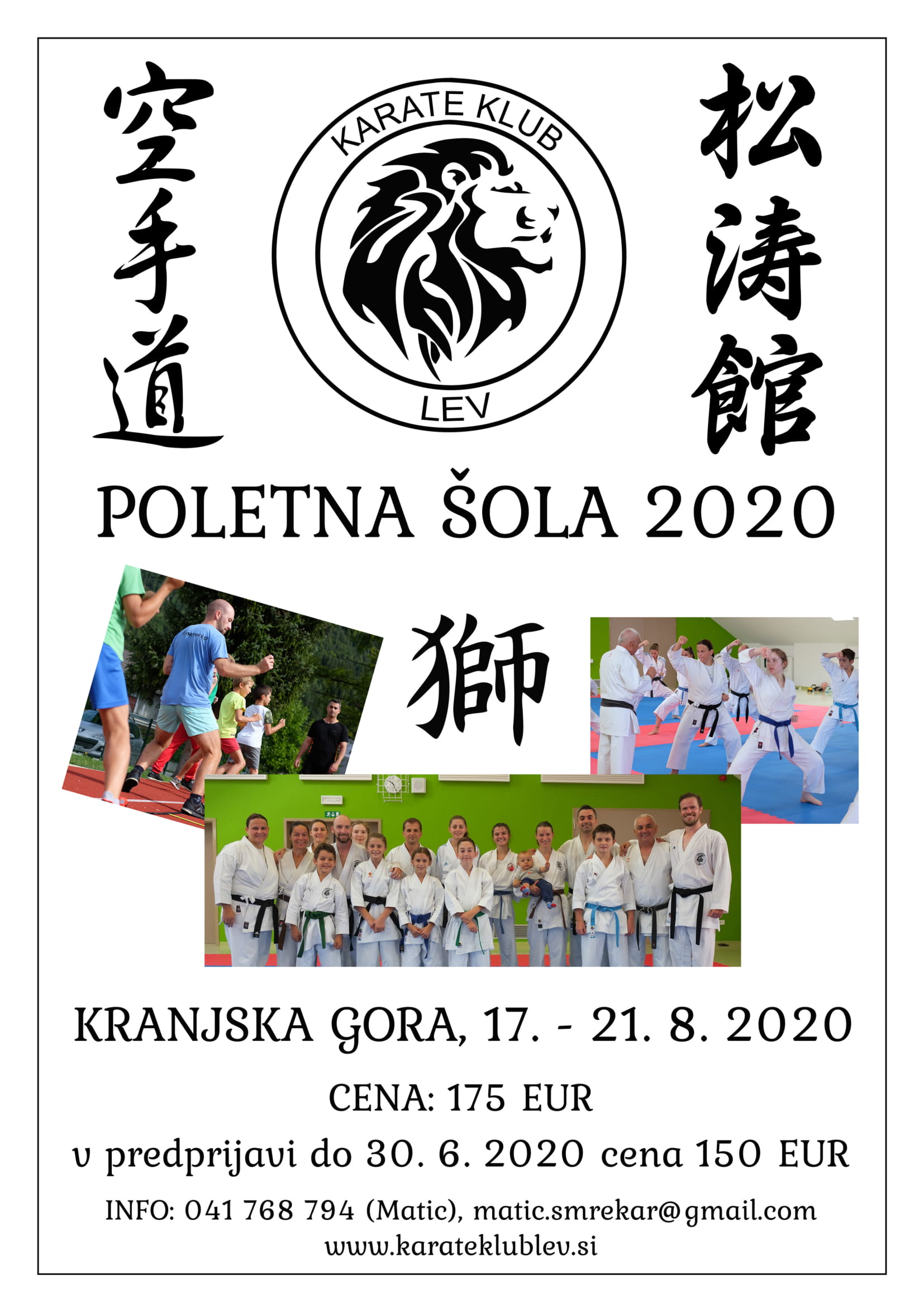 Tudi letos se bomo v drugi polovici avgusta odpravili na poletno karate šolo v Kranjsko Goro, ki z idilično kuliso čudovite narave kar sama vabi in ponuja številne aktivnosti, ki so primerne prav za vsakega člana vaše družine. Dobrodošli so tudi hišni ljubljenčki, da bo imela naša kužika Freya družbo ?